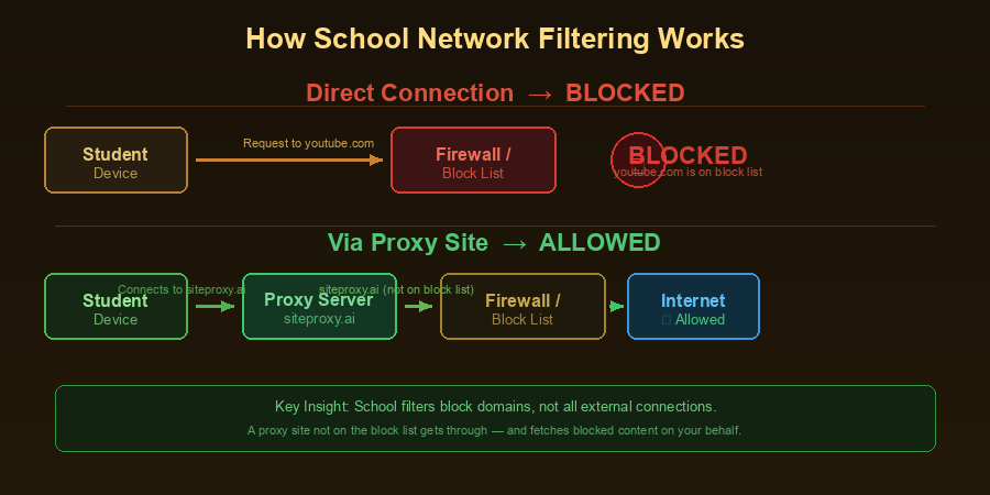 A free proxy site like SiteProxy lets you access blocked websites by routing your traffic through a proxy server. The school network sees you connecting to the proxy site — not to the blocked site directly. This is the most popular working proxy site method for school networks.